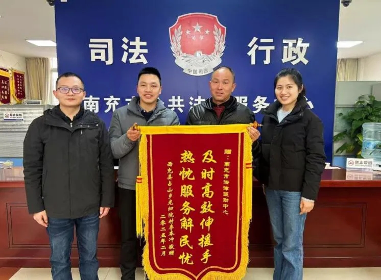 2025年2月,春寒料峭,老李骑着摩托车从西充县赶到南充市法律援助中心。这一次的老李,脸虽然被凉风吹得通红,但却喜上眉梢。他从背包里小心翼翼地取出一面印着“及时高效伸援手 热忱服务解民忧”的锦旗递给法律援助中心的工作人员:“这个荣誉你们值得!你们真正做到了为人民服务,希望咱们法律援助中心越办越好!”。