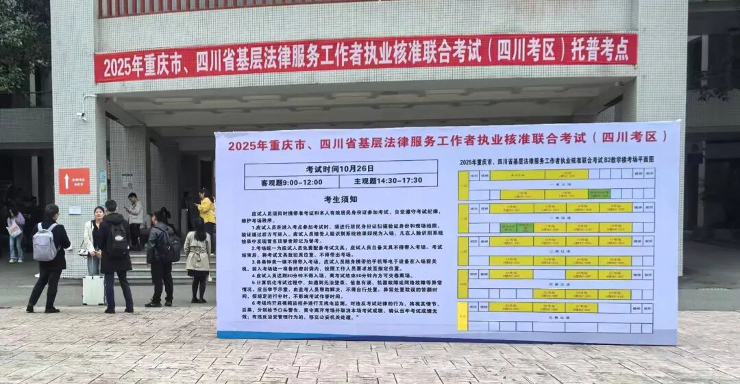 10月26日,2025年重庆市、四川省基层法律服务工作者执业核准联合考试(以下简称“川渝联考”)顺利结束。四川考区设置1个考点、27个考场,1254名考生报名参加考试。联考过程运行平稳,考试组织有序、保障有力,为考生营造了公平、安全的考试环境。
