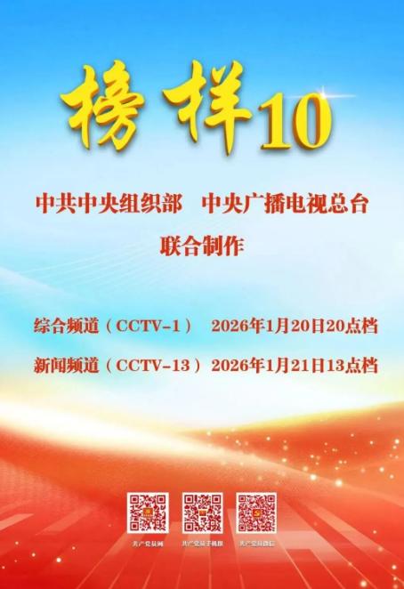 该节目将于2026年1月20日在中央电视台综合频道(CCTV-1)晚间8点档首播,1月21日在中央电视台新闻频道(CCTV-13)13点档重播,在共产党员网(www.12371.cn)、共产党员手机报(12371.people.com.cn)、共产党员微信(gcdyweixin)、全国党员干部现代远程教育专用频道集中展播。共产党员网首页提供节目下载。请学习收看。