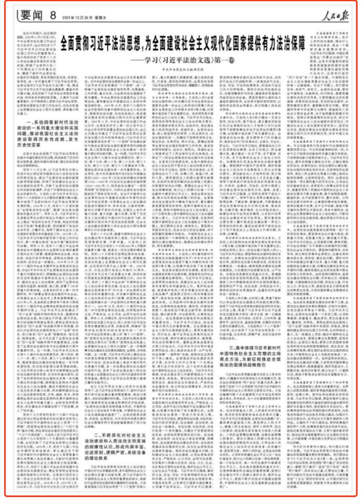 法治兴则国兴,法治强则国强。2025年11月17日至18日,中央全面依法治国工作会议在北京召开,会议传达学习了习近平总书记对全面依法治国工作作出的重要指示。指示深刻总结了党的十八大以来法治建设取得的历史性成就,明确了当前和今后一个时期法治工作的重点任务,擘画了新时代全面依法治国的宏伟蓝图,具有很强的政治性、思想性、指导性,进一步丰富发展了习近平法治思想。会前出版的《习近平法治文选》第一卷,精选习近平总书记关于法治建设最重要、最基本的文稿69篇,系统反映了习近平法治思想的丰富内涵、科学体系和原创性贡献。认真学习这部重要著作,对于持续深入贯彻习近平法治思想,全面推进国家各方面工作法治化,在法治轨道上全面建设社会主义现代化国家,具有重大现实意义。