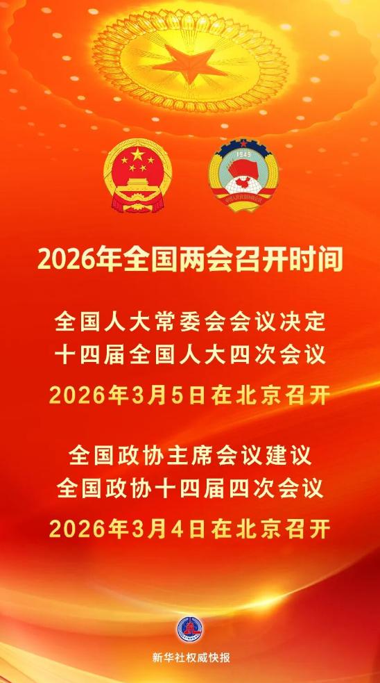 全国人大常委会会议12月27日表决通过了关于召开十四届全国人大四次会议的决定。根据决定,十四届全国人大四次会议于2026年3月5日在北京召开。